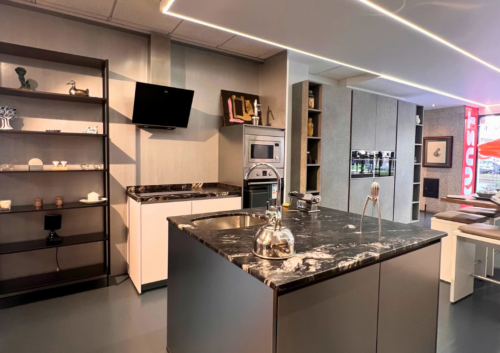 Cocina alemana con muebles ensamblados de fabrica en acabado laminado lacado diseño acero cepillado. Carcasa exterior en Gris seda e interior Blanco. Herraje alemán de calidad premium Hettich (freno, ajuste de puertas en 3 direcciones, cajones y gavetas removibles). Zócalo 10 cm. Encimera granito Titanium Satinado 2 cm con faldón en lineal e isla en 2 cm. Fregadero y grifo en acabado INOX.