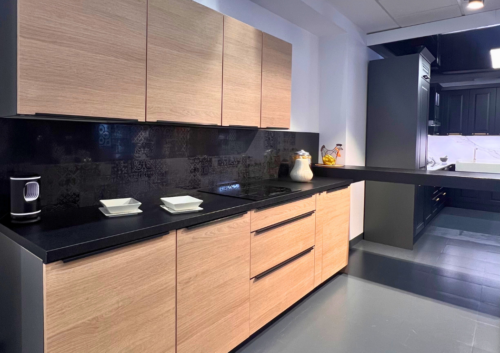 Cocina alemana con muebles ensamblados de fabrica en acabado diseño Roble. Carcasa exterior en Gris Pizarra e interior Blanco. Herraje alemán de calidad premium Hettich (freno, ajuste de puertas en 3 direcciones y frente de cajones y gavetas removibles). Zócalo 10 cm. Encimera postformado negro 38mm. Tiradores integrados negros.
